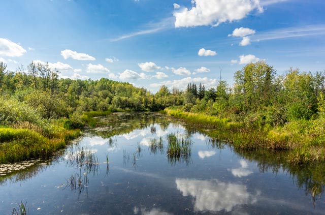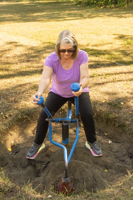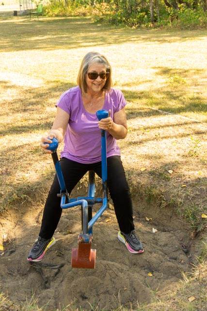 We decided to take a drive south of Dawson Creek to see the countryside. We stopped at Sudeten Provincial Park, which was closed for the season. Undeterred, we parked and walked in. The land for this park was donated to the people of British Columbia by Henriette Herold of Tomslake. The park is named for the region in Europe where many of the settlers in this region originally lived. Cathy is having fun in the child’s park, attempting to master the model backhoe. In addition, there were camping sites, a covered picnic pavilion and walking trails.