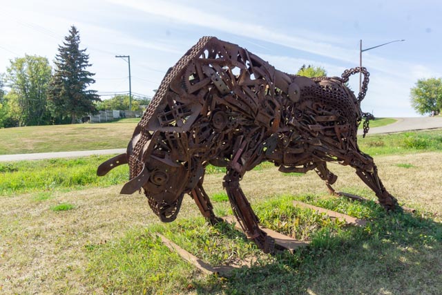 We drove to the town of Pouce Coupe. We detoured several times to take portions of the original Alaska Highway but returned to the modern highway to continue on. A good amount of Pouce Coupe residents moved closer to Dawson Creek when it started to develop around the new railroad. We stopped when we saw these sculptures near the roadway, they are made from scrap iron of all types.