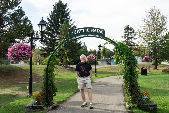 I stood under the archway leading into Beattie Park. The Beattie family was one of the first families to move into Hudson’s Hope in 1914. They outgrew their original log home and in the 1930s built a larger home in Gold Bar. In 1934 it was fitted with running water, a virtual mansion in this area. The Beattie farm was by far the most valuable property along the Peace River and they were frequently visited by great numbers of travelers moving up and down the river. Eventually the farm was sold to BC Hydro and was flooded by the W.A.C. Bennett Dam.