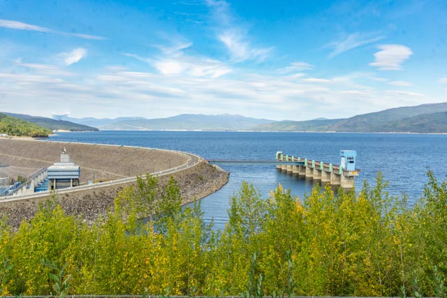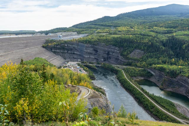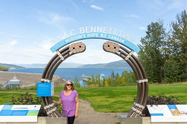 Cathy standing at the W.A.C. Bennett Dam-site. The area just below the earth-filled dam is carved from the bedrock and clearly shows veins of coal. It replace a coal mine that was originally built in 1903 and later supplied coal to troops building the Alaska Highway. The lake created on the Peace River is supplied by a drainage area twice the size of England. The coal mine was sealed off during construction and is now part of the dam.