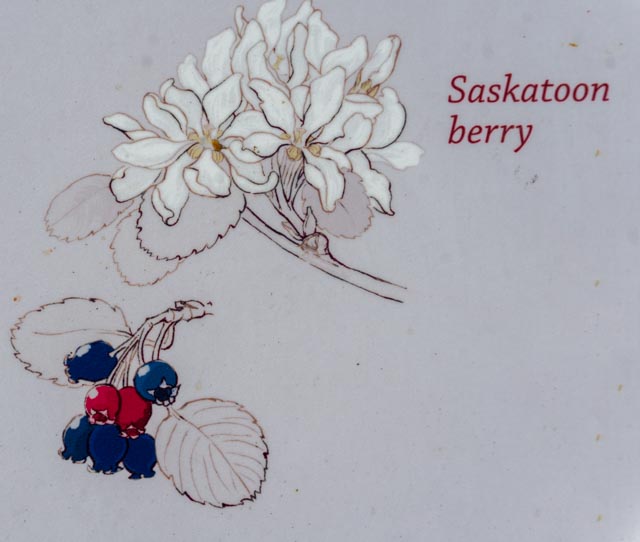 Above is a sample of some of the common medicinal and food plants found in this area. First Nation people (who had lived in this area and were displaced by the dam project) used these plants for years. Celery, peppermint and muskeg tea, along with the berries, Saskatoon, huckleberry, cranberry, blue berry and wild strawberry grow wild here and can be used for flavorings and food, while traditional medicine plants including rose-hip, rat root, mountain ash, young popular trees, yarrow and Kinnikinnick. BUT the signage also warn us NOT to pick or eat the plants!